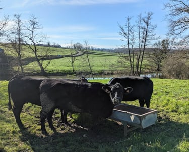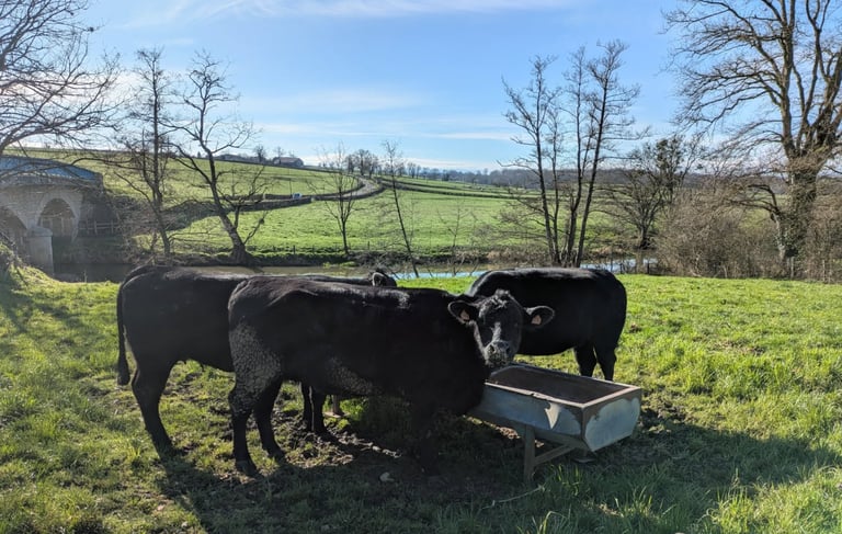 Exploitation familiale alliant élevage de vaches black Angus et écurie de chevaux.